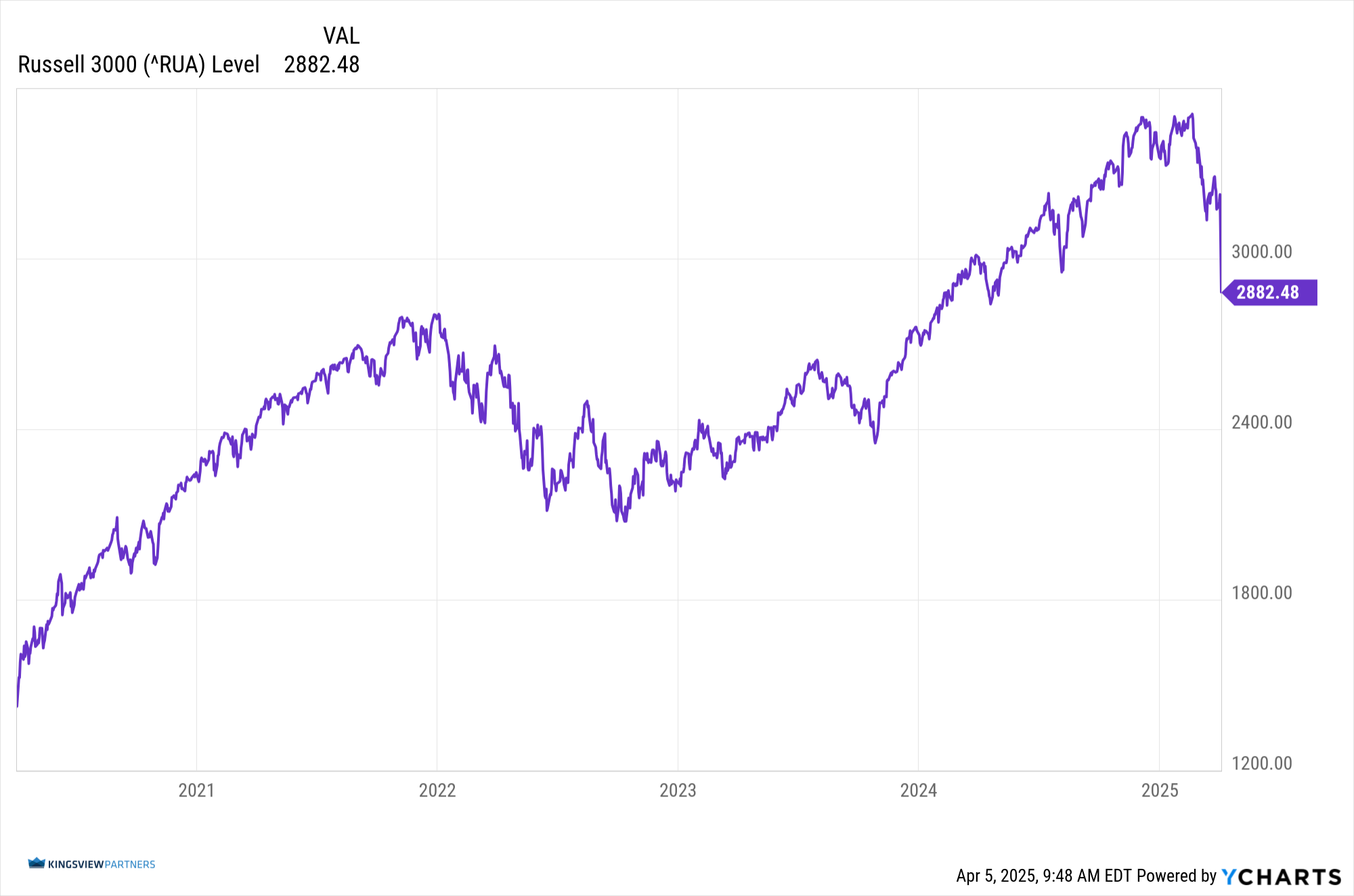 Updated: 4/7/2025. Historical references do not assume that any prior market behavior will be duplicated. Past performance does not indicate future results. This material has been prepared by Kingsview Wealth Management, LLC. It is not, and should not, be regarded as investment advice or as a recommendation regarding any particular security or course of action. Opinions expressed herein are current opinions as of the date appearing in this material only. All investments entail risks. There is no guarantee that investment strategies will achieve the desired results under all market conditions and each investor should evaluate their ability to invest for the long term. Investment advisory services offered through Kingsview Wealth Management, LLC (“KWM”), an SEC Registered Investment Adviser.