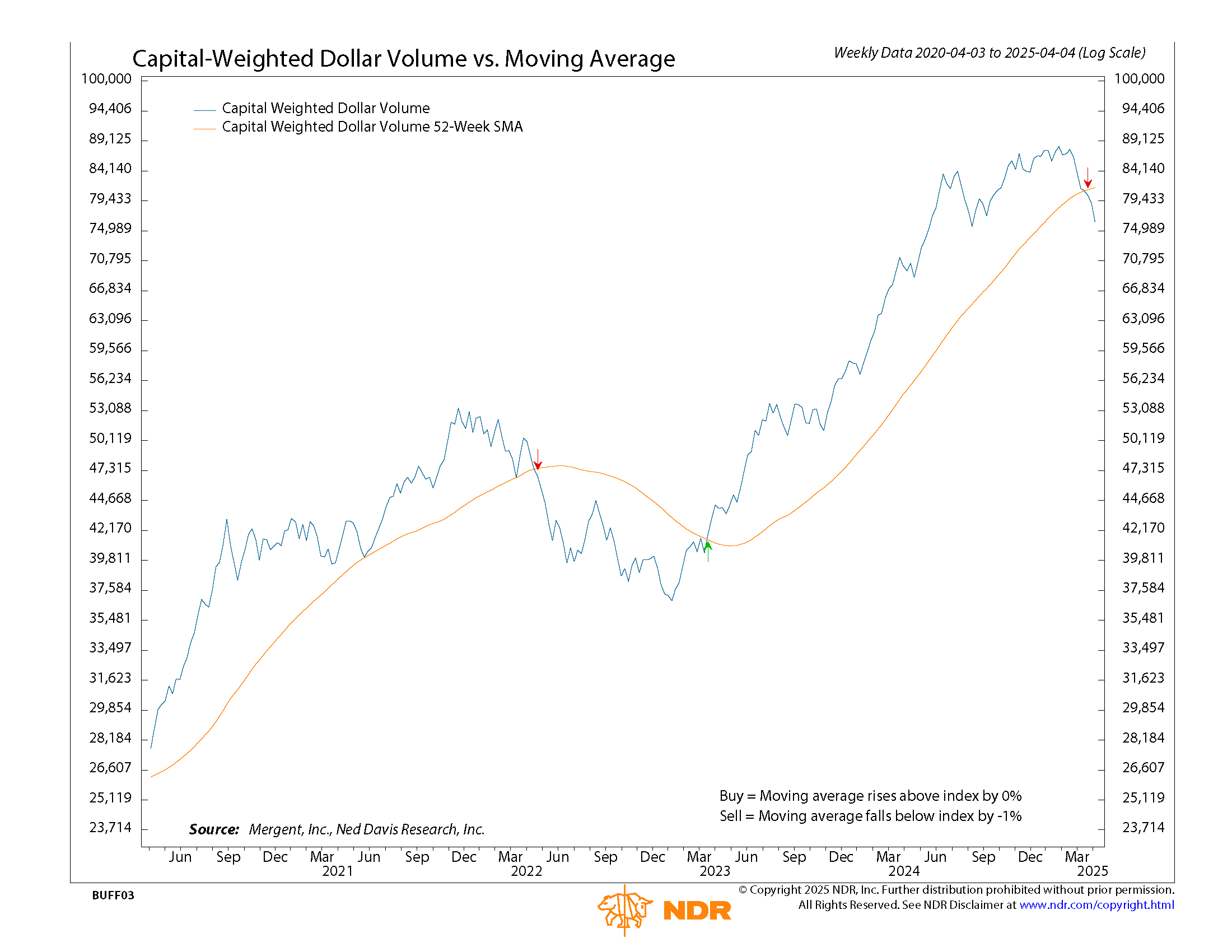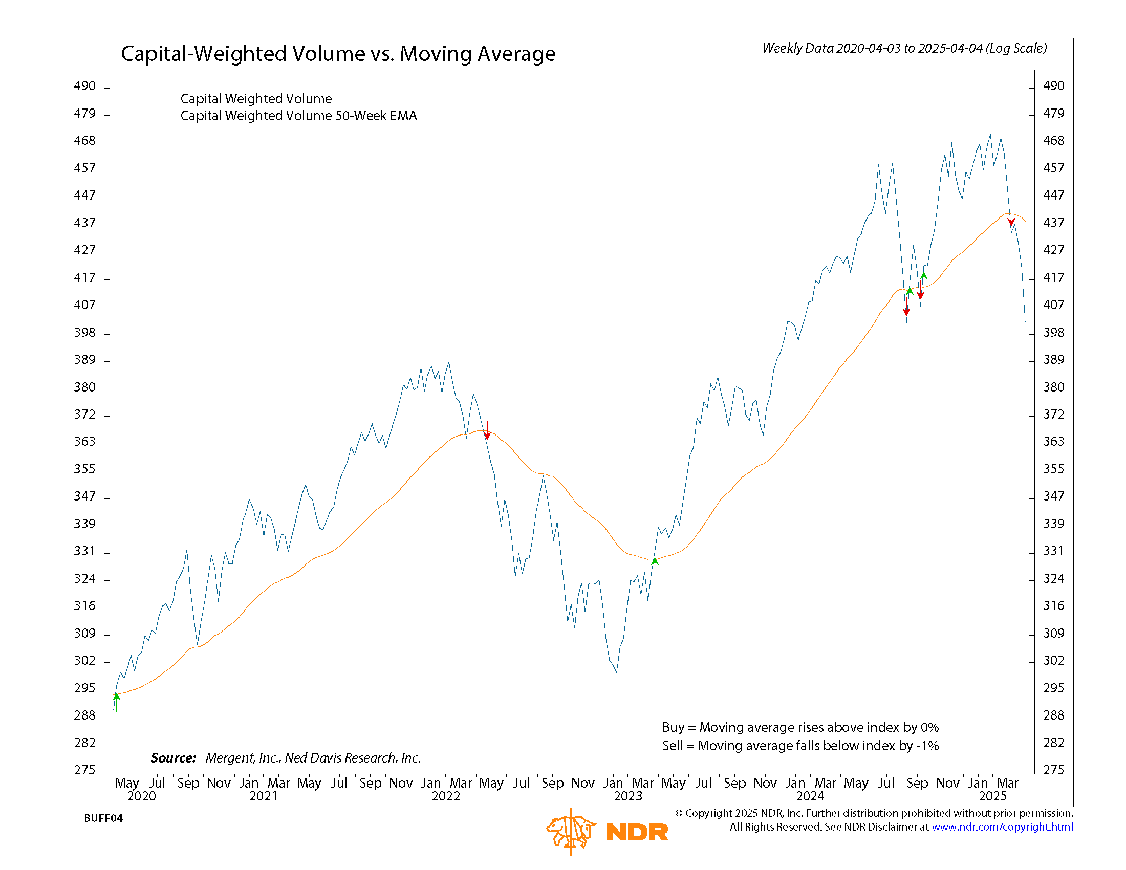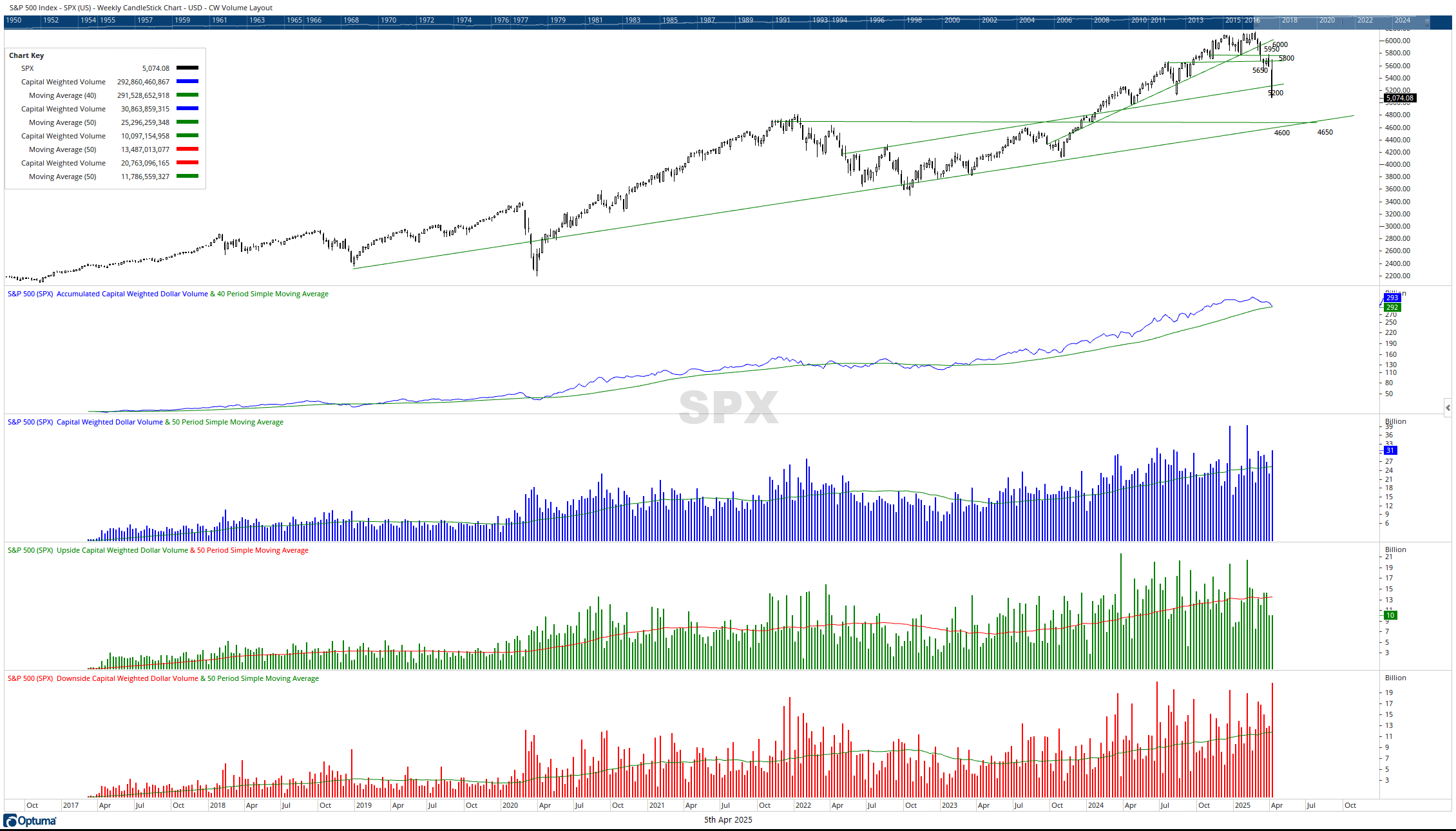 This past week, the market’s price trend finally aligned with its volume trends, which broke down a month earlier. On Thursday, April 3rd, the bears notched a 95% downside volume day on above-average S&P 500 capital weighted volume. This impressive performance was eclipsed on Friday, April 4th, with a staggering 99% downside volume day on high capital weighted volume. For the week, both capital outflows and capital weighted downside volume outpaced inflows and upside volume at a 2:1 ratio on above-average volume. Despite the price destruction, these volume statistics, while bearish, reveal that less harm was done internally than might be perceived on the surface. However, the breakdown in volume and capital flow trends we highlighted last month continues to deteriorate.