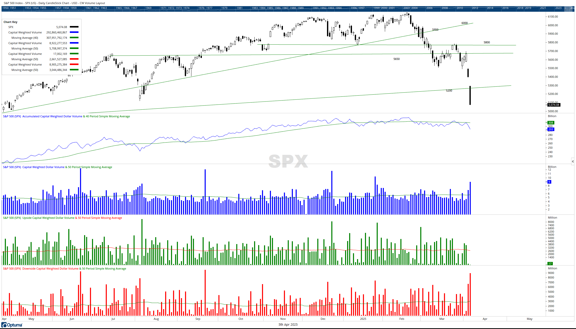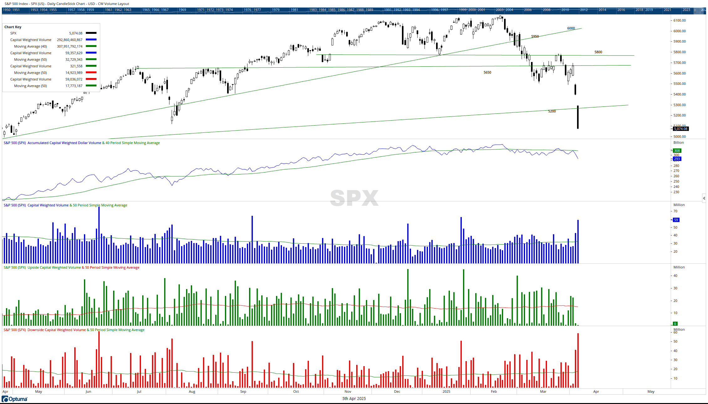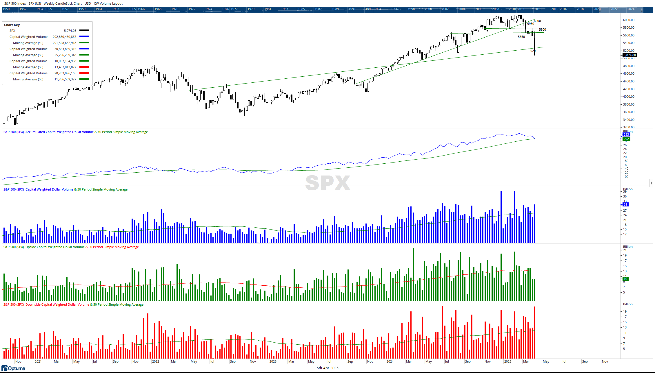 This past week, the market’s price trend finally aligned with its volume trends, which broke down a month earlier. On Thursday, April 3rd, the bears notched a 95% downside volume day on above-average S&P 500 capital weighted volume. This impressive performance was eclipsed on Friday, April 4th, with a staggering 99% downside volume day on high capital weighted volume. For the week, both capital outflows and capital weighted downside volume outpaced inflows and upside volume at a 2:1 ratio on above-average volume. Despite the price destruction, these volume statistics, while bearish, reveal that less harm was done internally than might be perceived on the surface. However, the breakdown in volume and capital flow trends we highlighted last month continues to deteriorate.