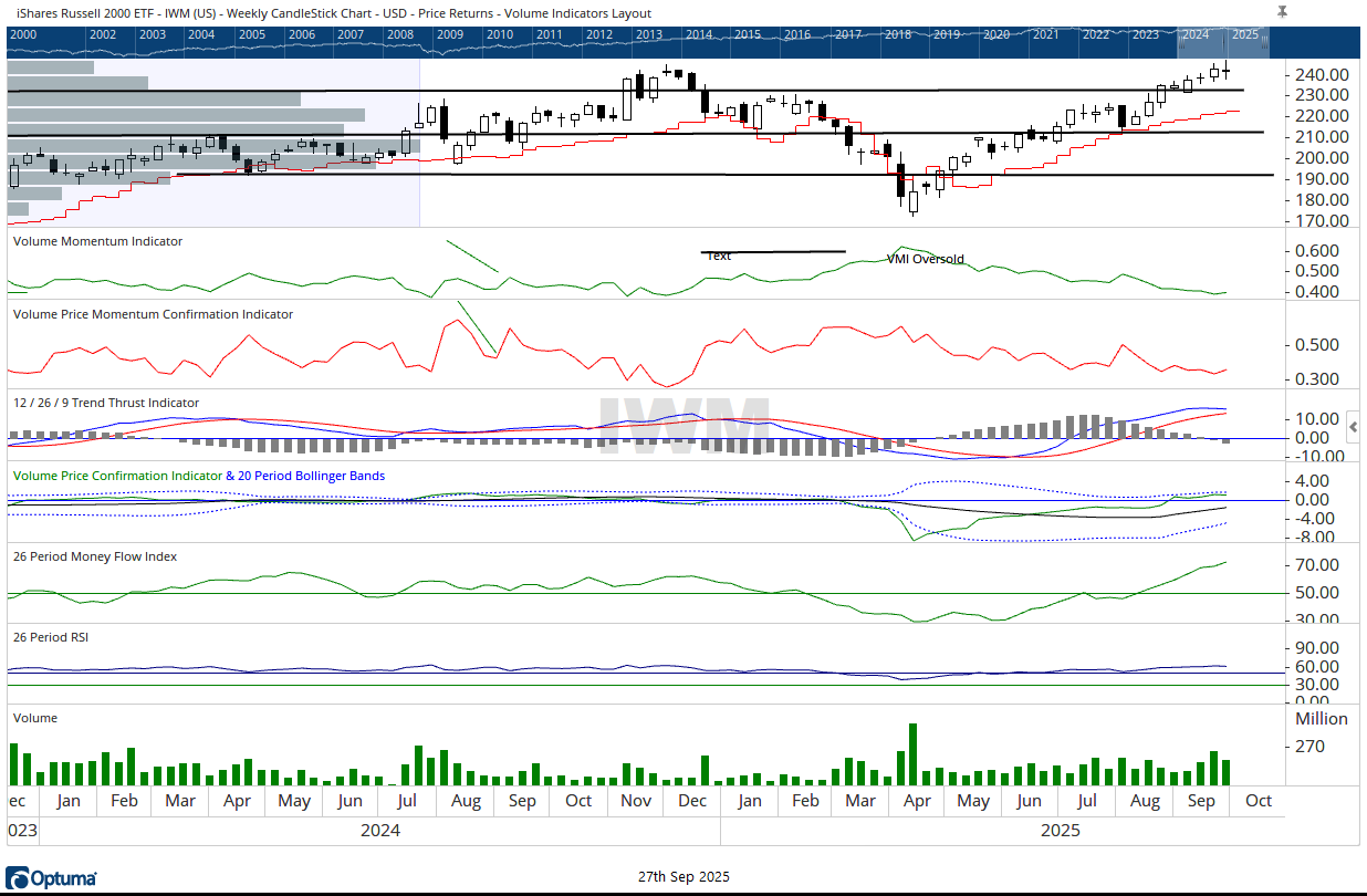 The generals, Invesco QQQ Trust (QQQ), closed the week down -0.54%, leaving behind their own doji, a sign of hesitation after recent strength. The troops, iShares Russell 2000 ETF (IWM), suffered a slightly larger retreat, down -0.63%, and marked the field with a long-legged doji. This formation suggests a market pushed violently in both directions intraweek, only to settle back near its opening levels. Such candles reflect exhaustion and uncertainty: a selloff reversed by late buying and then quickly met by strong resistance. In such cases, volatility without direction may foreshadow an imminent turning point.