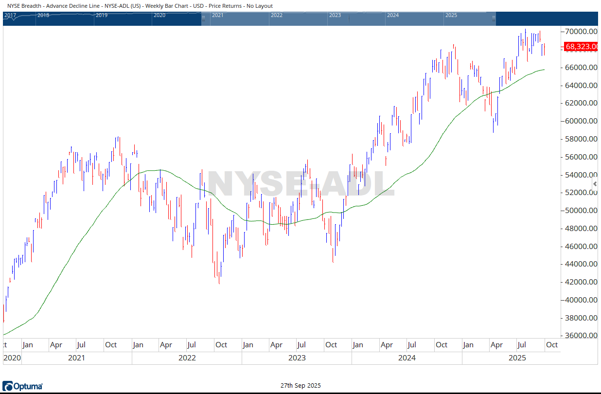 The Advance–Decline Line was engulfed within last week’s range. However, unlike the prior week’s weak close near the bottom of the bar, this week finished near the top. Together, this formation forms a spinning top, yet another sign of market indecision. Breadth has not yet broken out, but it no longer sits in retreat, a tentative sign of resilience.