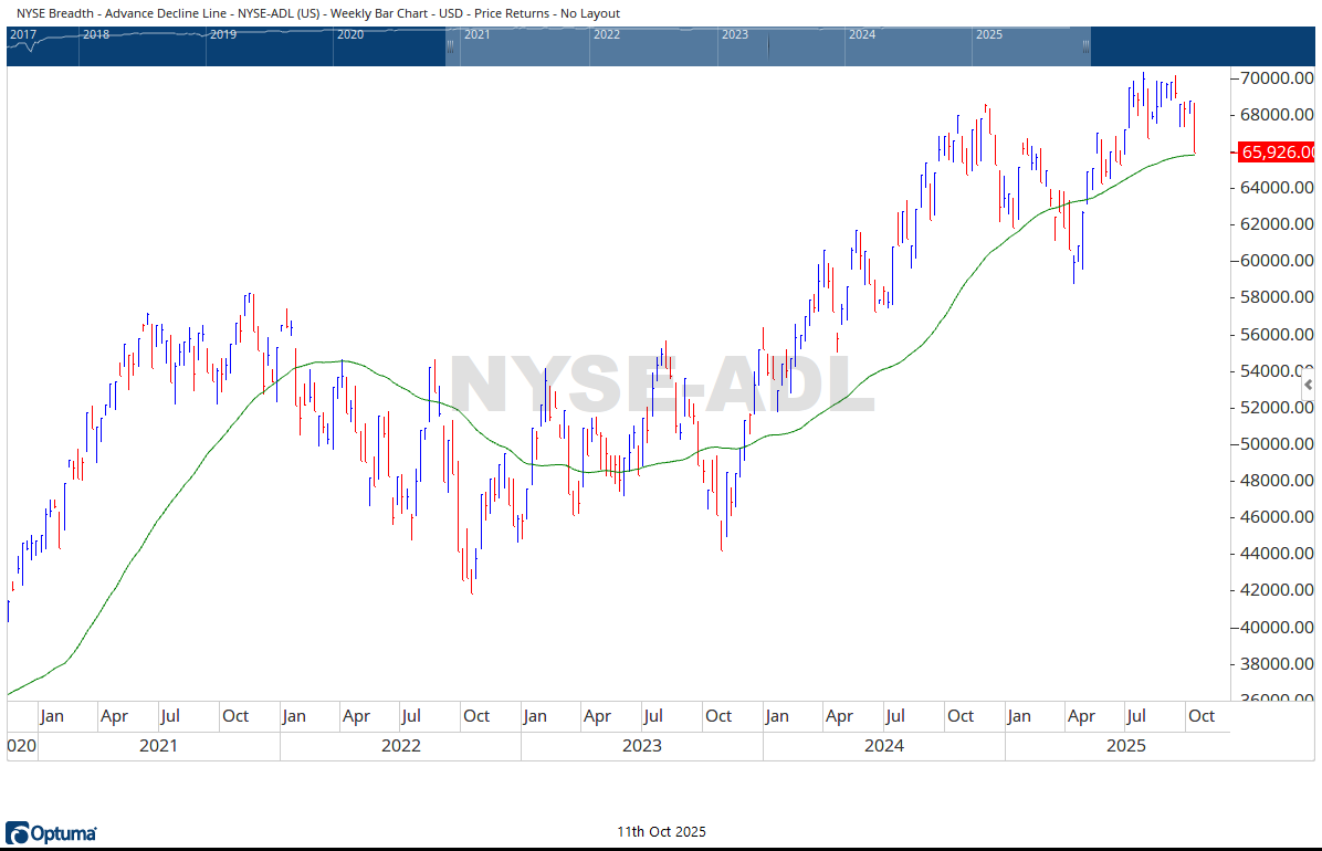 Beneath the surface, however, market participation weakened. The NYSE Advance–Decline Line breached not only its September lows but also August’s, illustrating that the broader formation has lost some depth. Even so, the measured move managed to close just above its 50-week moving average, holding the line of long-term trend support. Looking ahead, the next tactical levels for the S&P 500 include near-term support at 6480, with major reinforcements positioned at 6200.