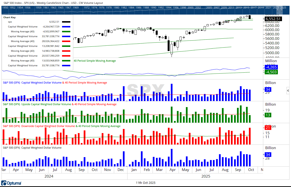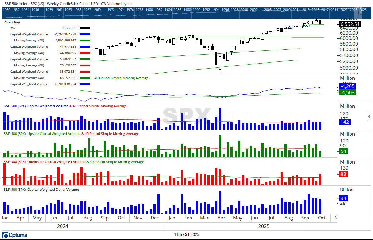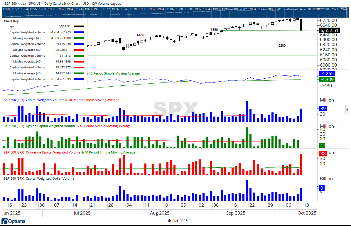 On October 10, 2025, the S&P 500 fell -2.71%, with an overwhelming 98% of Capital Weighted Volume to the downside. While overall volume surged well above average, selling pressure did not match the intensity of the upside breakout sessions from mid-September’s offensive. The index closed near the 6550 support zone, a key defensive position for the current campaign.