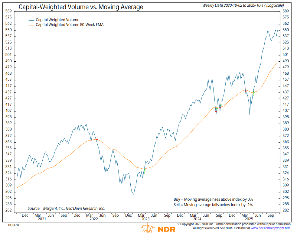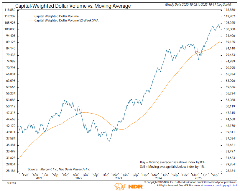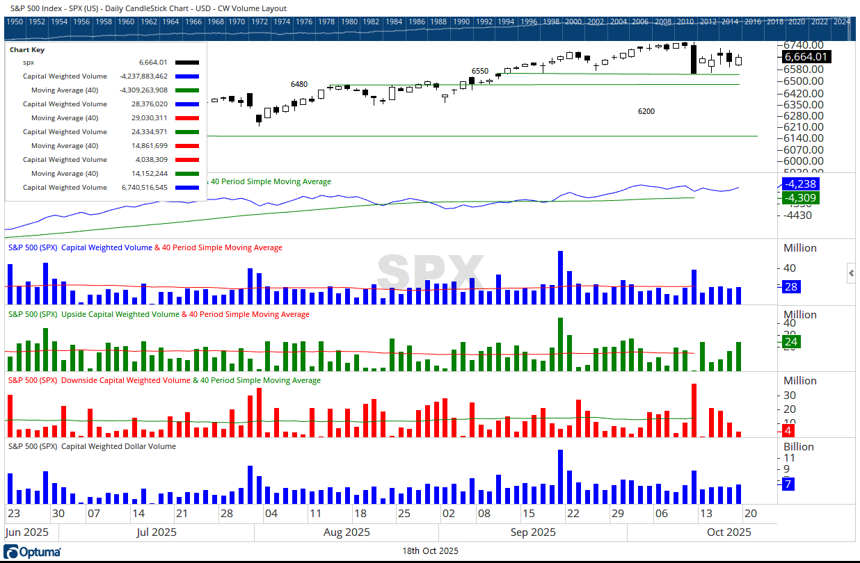 - While price closed mid-bar of 10/10’s range, the trend lines for both CW volume and capital flows remain near their all-time highs, showing mild leadership beneath the surface.