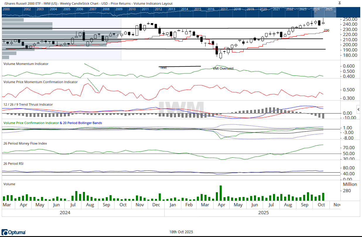 - The “troops”, represented by the iShares Russell 2000 ETF (IWM), closed also in the mid-range but earlier in the week executed an intra-week breakout to a fresh all-time high. Momentum here is stronger still: MFI ~80 versus RSI ~59, showing vigorous underlying accumulation.