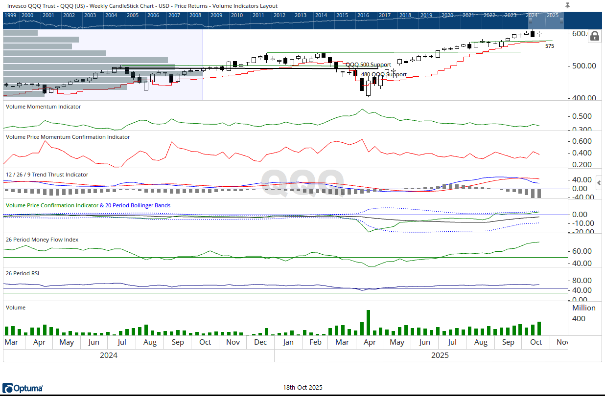 - The “generals”, represented by the Invesco QQQ Trust (QQQ) held their ground inside the 10/10 range, closing near the mid-point. Importantly, QQQ’s volume momentum (MFI ~75) exceeds its price momentum (RSI ~63). This suggests fuel remains in the tank.