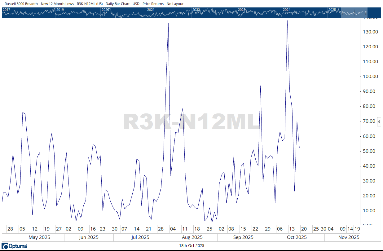 - Meanwhile, across the broader equity universe, the Russell 3000 is showing rising new-lows, which signals growing internal deterioration even if the surface advance remains intact. In other words: more stocks within that broad 3,000-stock basket are making fresh lows, which speaks to fragility beneath the façade of stability.