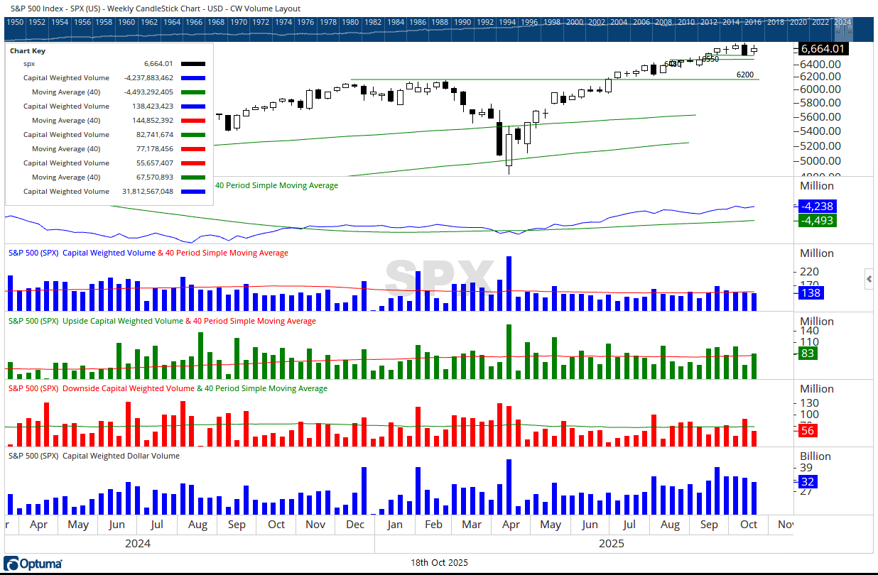 This week our market “army” repositioned under cover. The S&P 500® Index remained entirely inside last Friday’s (10/10/2025) long bar, a tactical inside-week formation at the rear of the frontline. The battlefield quieted, yet the under-surface currents show both risk and latent potential.