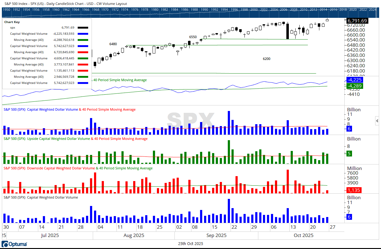 The S&P 500 Index broke above last week’s outside bar’s resistance to record a new all-time high. Although Thursday’s narrow inside session may have appeared unremarkable on the surface, the underlying dynamics told a more powerful story: upside volume overwhelmed downside volume by roughly 9-to-1, and capital inflows accounting for 94% of total activity creating the fuel propelling Friday’s breakout.