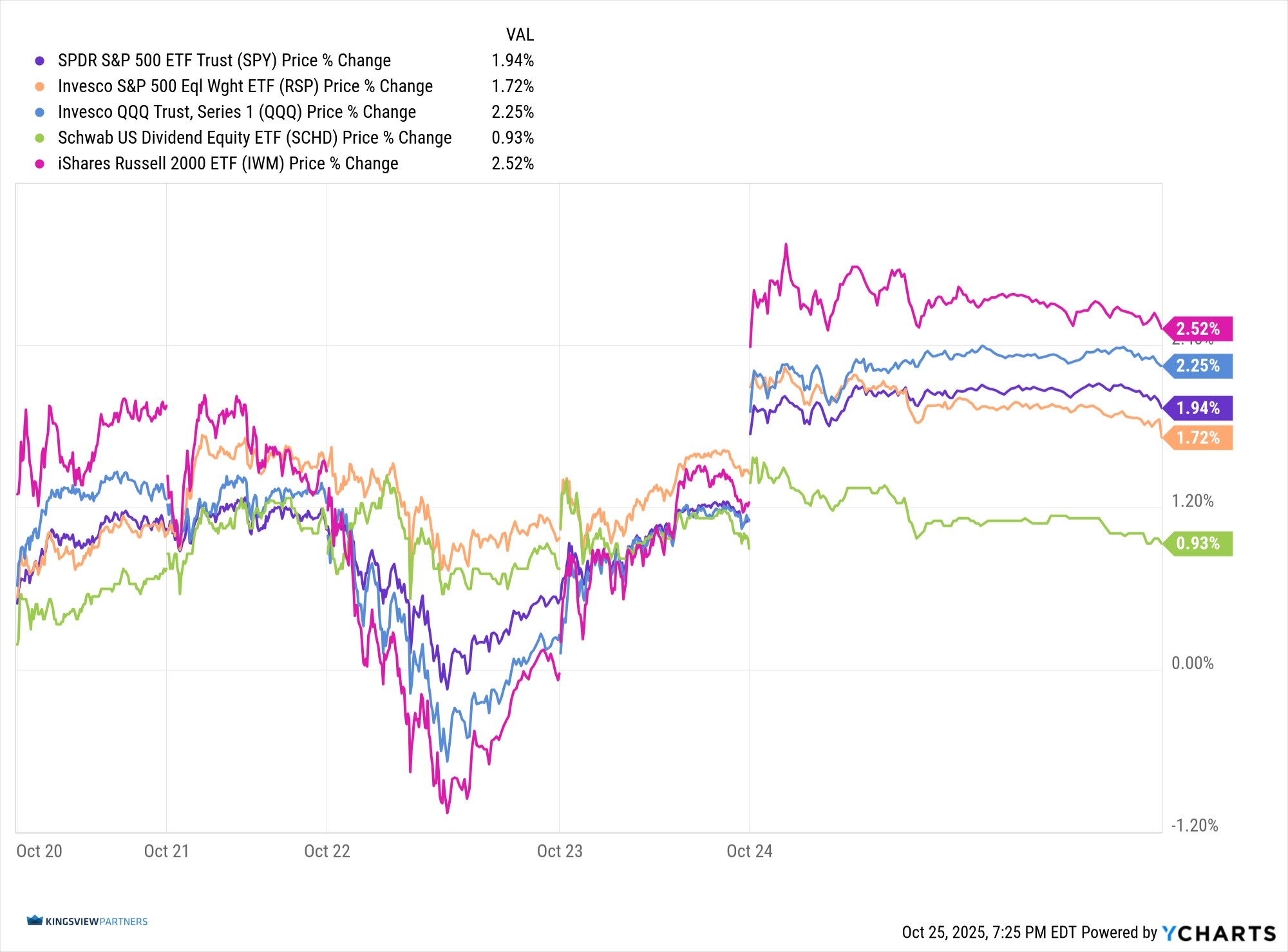 Among the tactical ranks, both the generals and the troops pressed forward. The Invesco QQQ Trust, Series 1 (ETF) gained 2.25% on the week, while the iShares Russell 2000 ETF (IWM) climbed 2.52%. The SPDR S&P 500 ETF Trust (SPY) and Invesco S&P 500 Equal Weight ETF (RSP) followed closely, up 1.94% and 1.72%, respectively. The brass commanders, represented by the Schwab U.S. Dividend Equity ETF (SCHD), advanced 0.93%, continuing to lag the broader force.