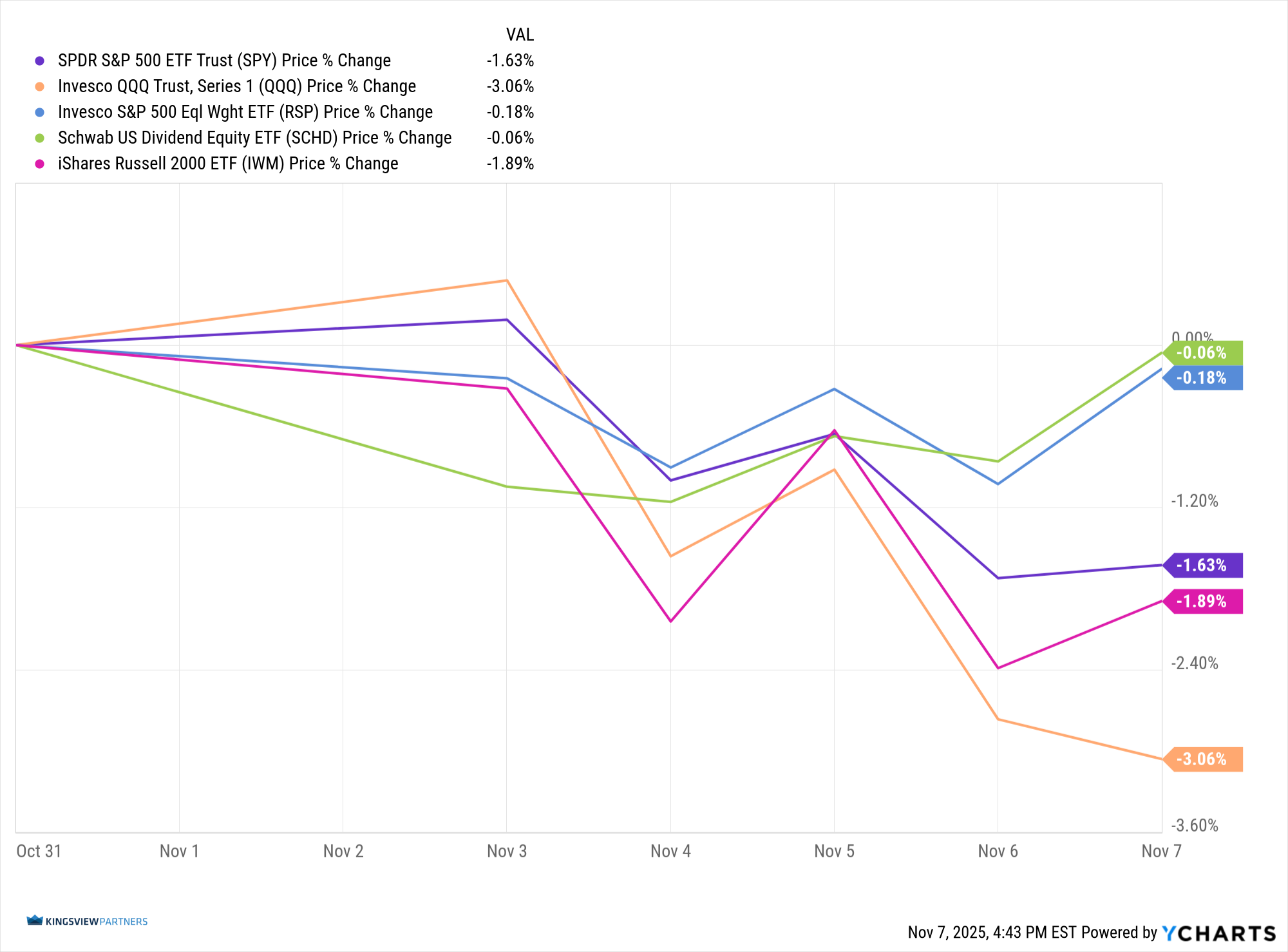 Updated: 11/10/2025. Historical references do not assume that any prior market behavior will be duplicated. Past performance does not indicate future results. This material has been prepared by Kingsview Wealth Management, LLC. It is not, and should not, be regarded as investment advice or as a recommendation regarding any particular security or course of action. Opinions expressed herein are current opinions as of the date appearing in this material only. All investments entail risks. There is no guarantee that investment strategies will achieve the desired results under all market conditions and each investor should evaluate their ability to invest for the long term. Investment advisory services offered through Kingsview Wealth Management, LLC (“KWM”), an SEC Registered Investment Adviser.