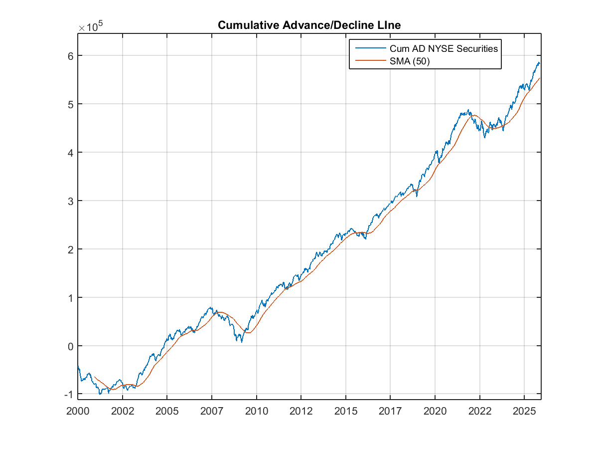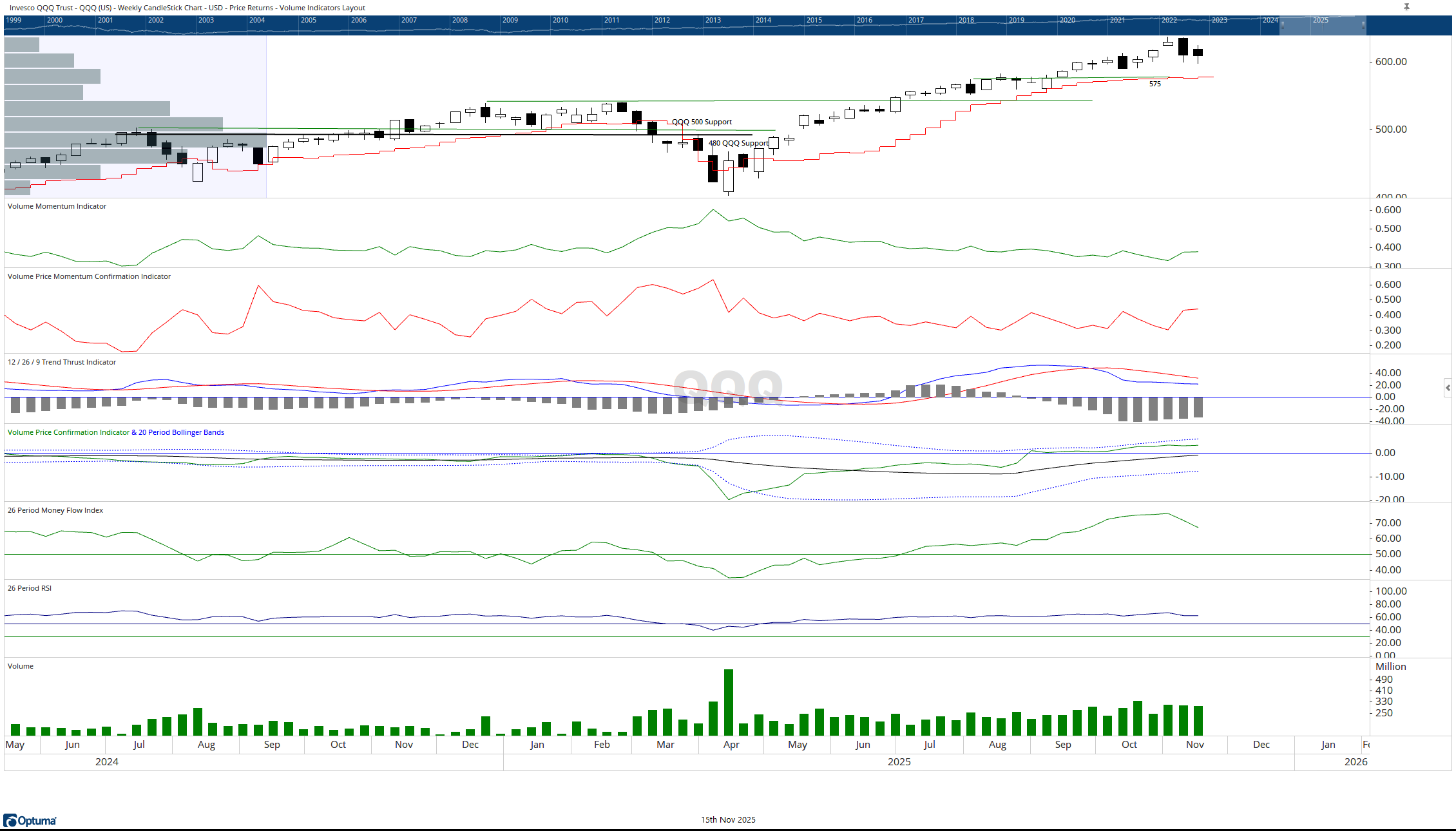 The NYSE Advance-Decline Line closed down on the week but remains above key support. The Invesco QQQ Trust held its lows, maintaining support around 575. The iShares Russell 2000 ETF likewise defended the 230 level, with its Money Flow Index at 72 and corresponding Relative Strength Index at 55, signaling a healthy fueled market.