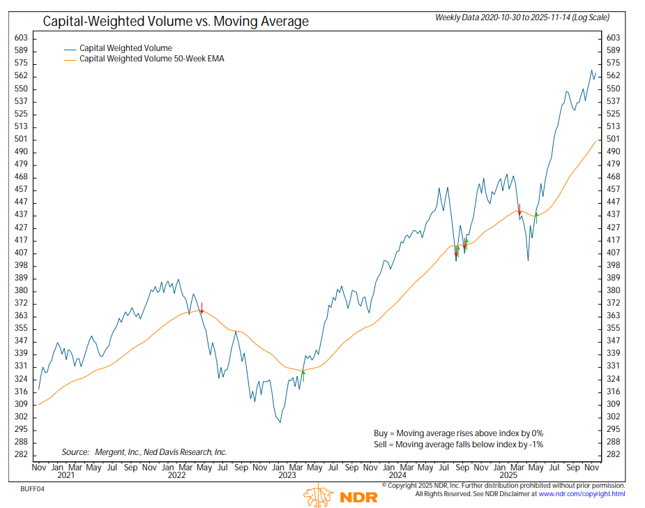 From a capital flow perspective, both inflows and outflows were above average on the week. The ratio of 53% inflows to 47% outflows suggests that, while the front lines remain contested, buying pressure continues to overmatch selling intensity. Meanwhile, both upside and downside capital-weighted volumes tracked near their typical averages, consistent with the theme of consolidation. The trend of both capital flows and capital weighted volume continue steadily higher.