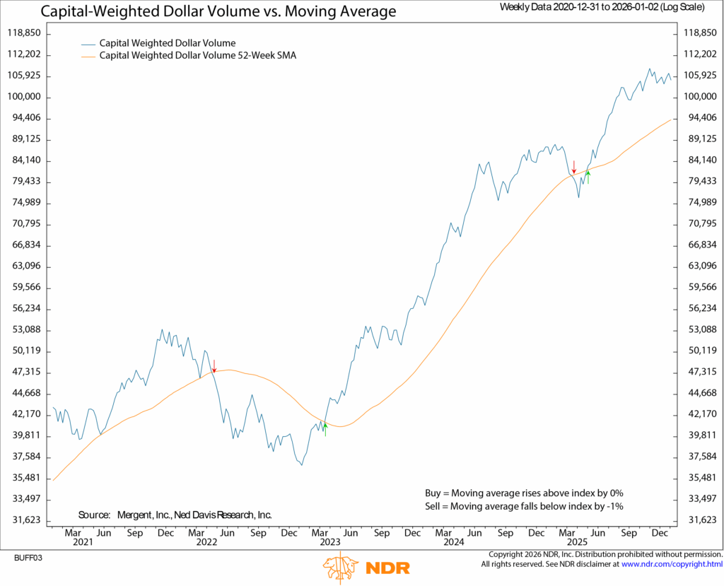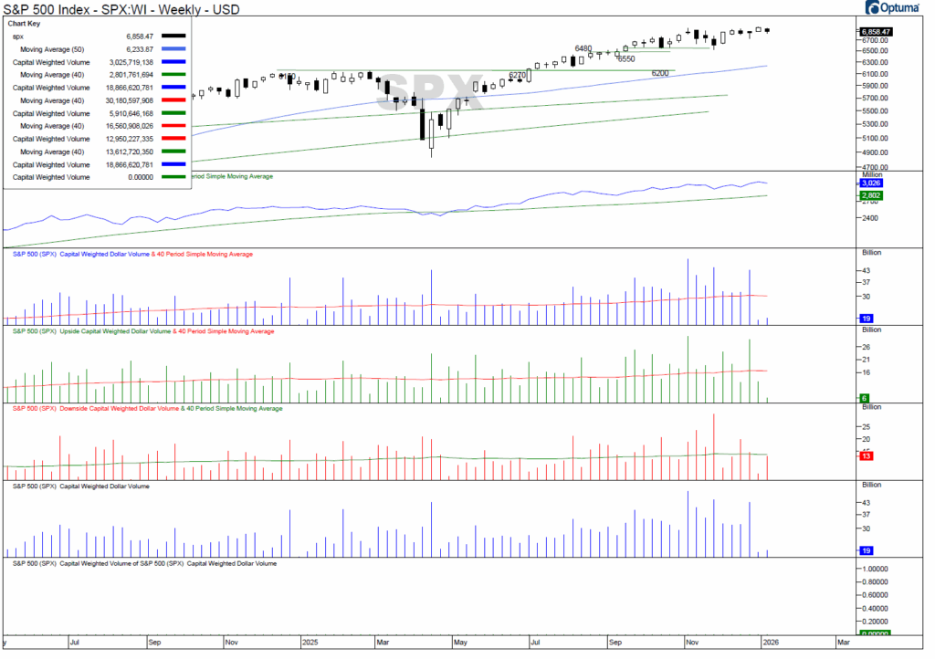 Volume conditions were notably subdued, even by short-week standards. Upside volume and capital inflows were particularly light, while Capital Weighted downside volume registered near average levels. The weakness occurred primarily within the year’s strongest performing units, consistent with late-year profit taking rather than broad-based liquidation. Overall, roughly 68% of total volume was weighted to the downside.