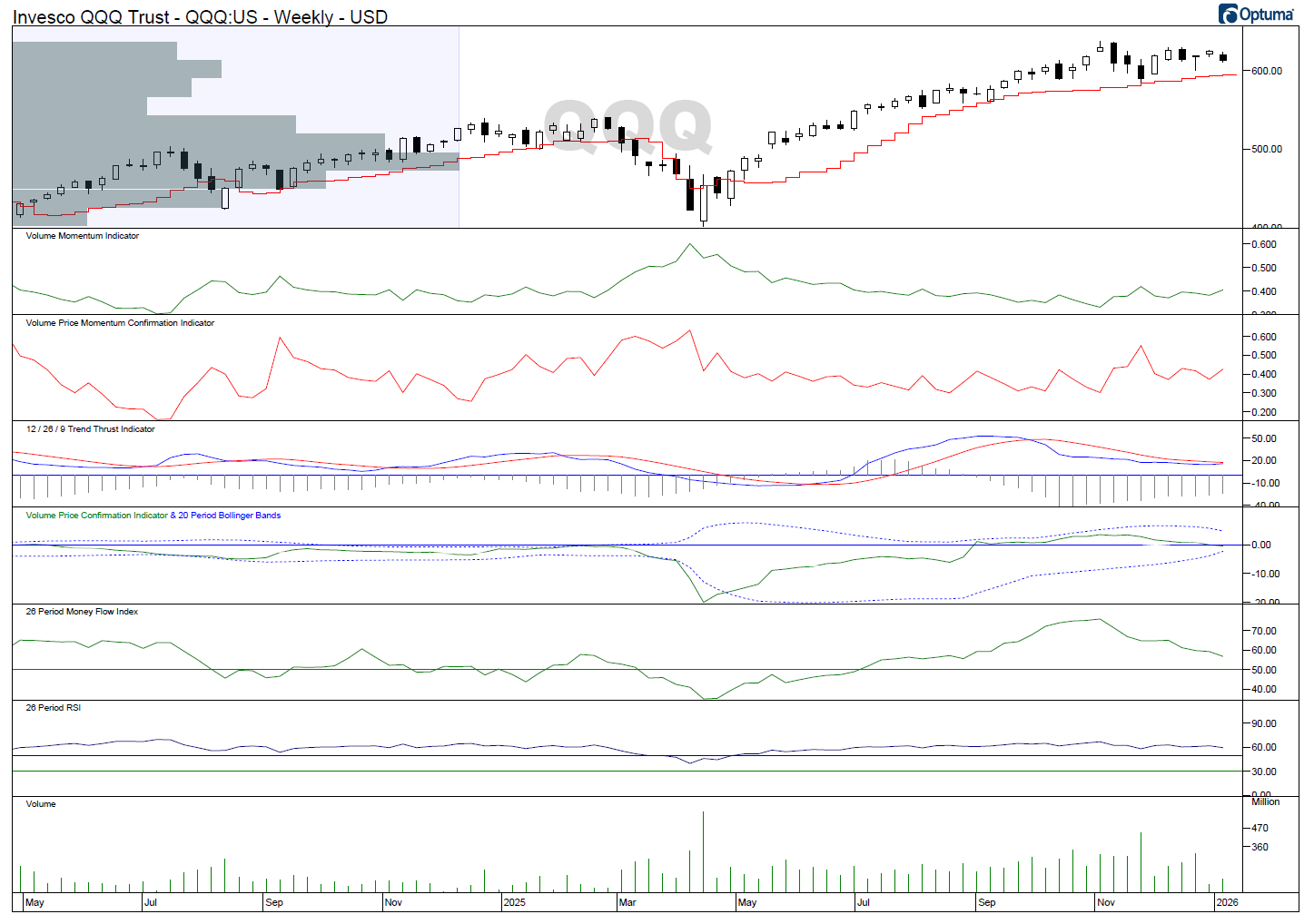 As the market closed the final chapter of 2025 and opened the first page of 2026, conditions softened with a broadening tone that favored relative defense over leadership. The S&P 500, represented by the SPDR S&P 500 ETF Trust, declined roughly 1% on the week. Leadership retreated more sharply, with the Invesco QQQ Trust, our generals, pulling back 1.7%. The troops, represented by the iShares Russell 2000 ETF, followed closely behind, falling 1.57%.