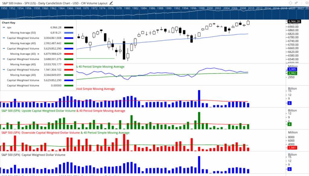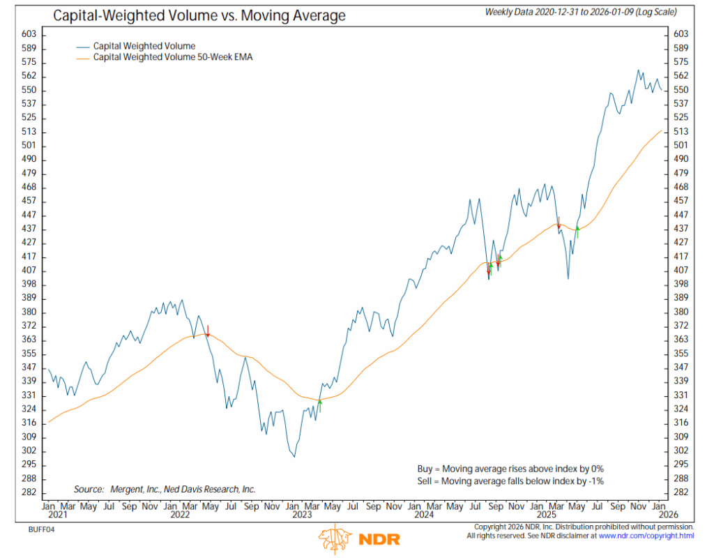 Despite higher prices, volume and capital flows revealed signs of distribution beneath the surface. On Tuesday, January 6th, the S&P 500 surged to close at a new all-time high, yet S&P 500 upside capital weighted volume was roughly half its daily average. Downside volume was well above average, with approximately three shares trading lower for every one advancing. Over the full week, S&P 500 downside volume remained above average while upside volume was well below average, resulting in 58% of capital weighted volume falling to the downside. Capital flows echoed this same message, with 53% of flows registering as outflows.