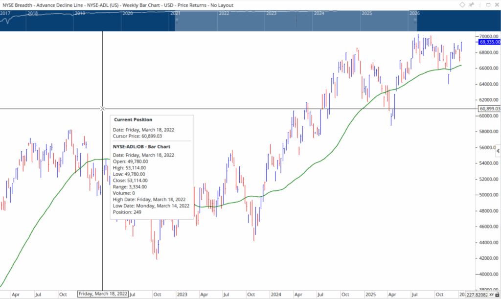 Market participation improved meaningfully. The NYSE Advance–Decline Line surged on the week, closing just above the upper boundary of the December 12th wide-range resistance. Similar to volume, the accumulated Advance–Decline Line remains in an upward trend but has yet to confirm price by reaching new highs.