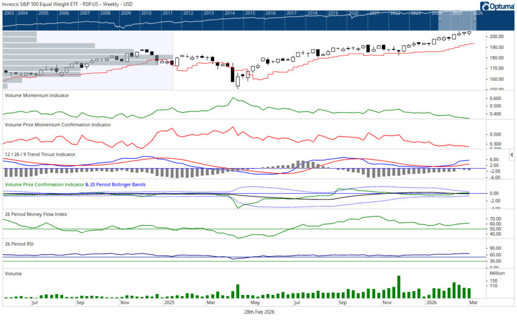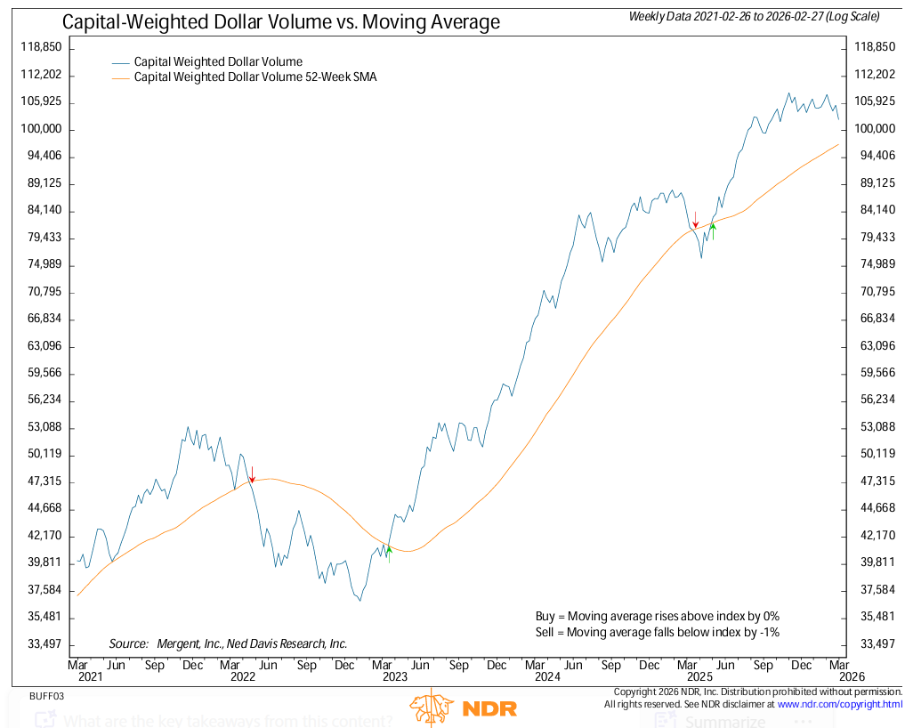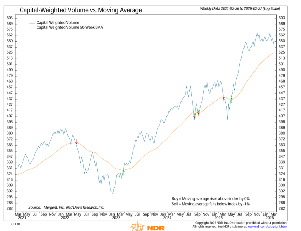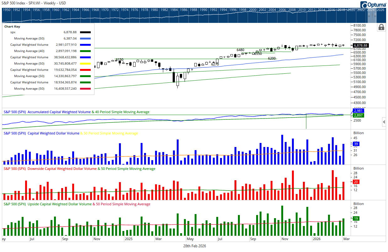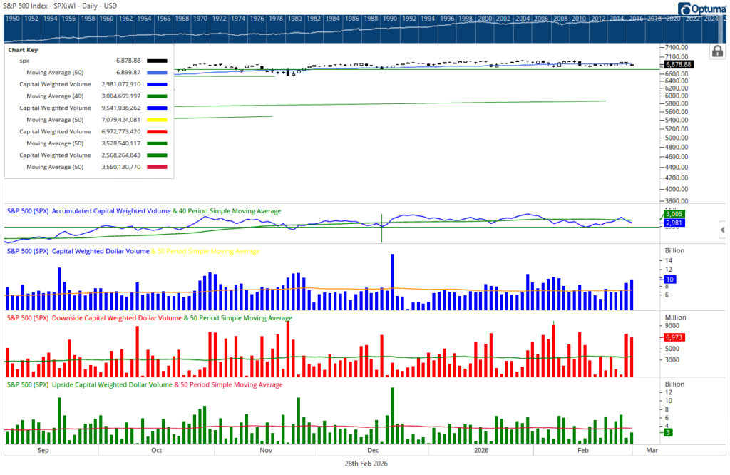 For the full week, upside volume finished near average while downside volume registered above average. Roughly 51% of Capital Weighted Volume and capital flows tilted to the downside. In sum, the market reached a form of equilibrium, but on elevated activity. Buyers and sellers both showed up, neither fully conceding ground.