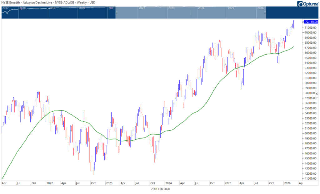 Market breadth continues to be the defining feature of this advance. The NYSE Advance–Decline Line recorded yet another weekly high, marking the fourth consecutive week of higher highs. This persistent expansion in participation underscores that capital is rotating rather than exiting. The ranks continue to widen even as headline indices consolidate.