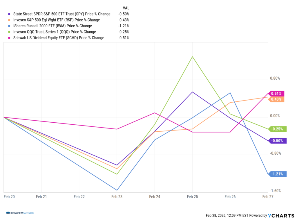 Updated: 3/2/2026. Historical references do not assume that any prior market behavior will be duplicated. Past performance does not indicate future results. This material has been prepared by Kingsview Wealth Management, LLC. It is not, and should not, be regarded as investment advice or as a recommendation regarding any particular security or course of action. Opinions expressed herein are current opinions as of the date appearing in this material only. All investments entail risks. There is no guarantee that investment strategies will achieve the desired results under all market conditions and each investor should evaluate their ability to invest for the long term. Investment advisory services offered through Kingsview Wealth Management, LLC (“KWM”), an SEC Registered Investment Adviser.