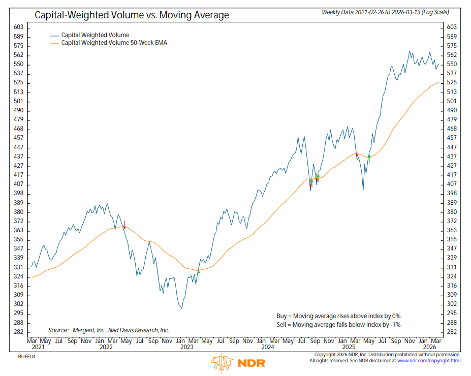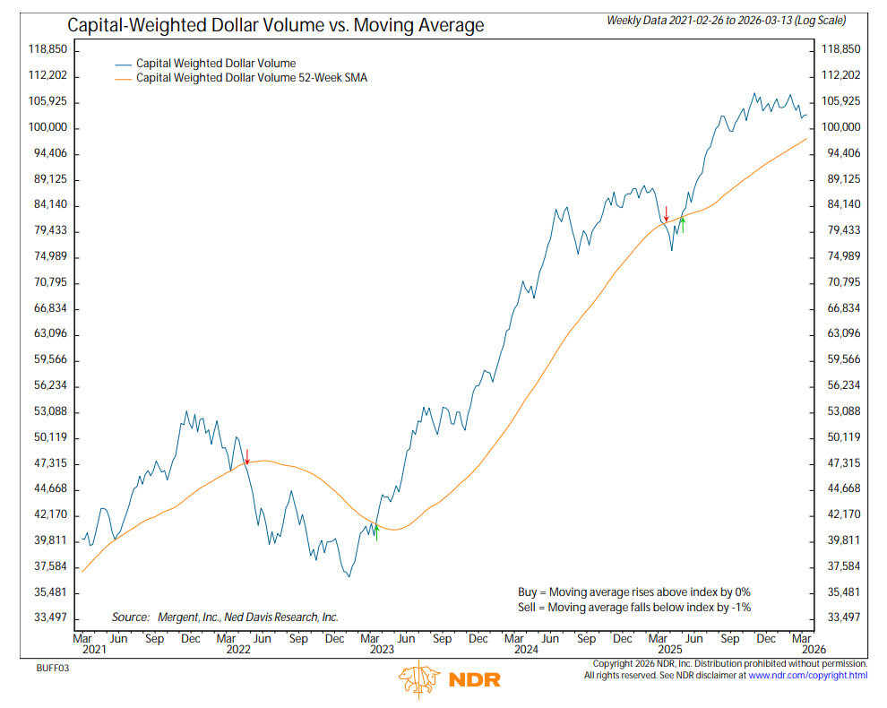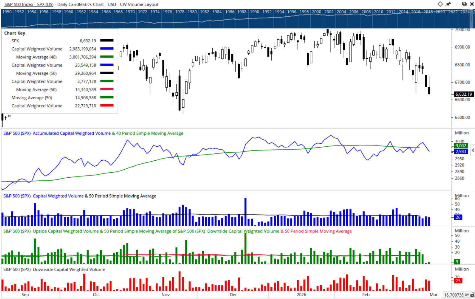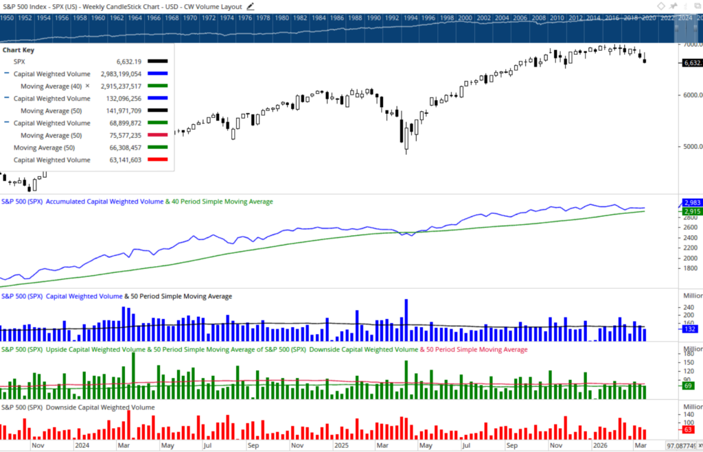 Despite the dramatic price swings, the weekly flow statistics remain surprisingly balanced. Capital Weighted Volume finished the week with 53% to the upside on below average total volume. Capital Weighted Dollar Volume also leaned slightly positive with 51% being inflows on average weekly dollar activity. In short, while prices have deteriorated noticeably since the onset of the Iranian conflict, volume and capital flows that had been weakening prior to the war have surprisingly stabilized rather than collapsed.