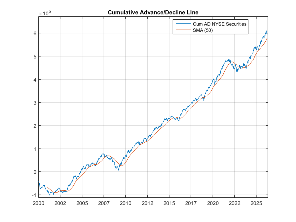 Breadth offered a temporary reprieve. The NYSE Advance Decline Line moved back above trend, suggesting participation attempted to broaden once again. Whether this proves to be a lasting resurgence or merely a short-term rebound remains to be seen.