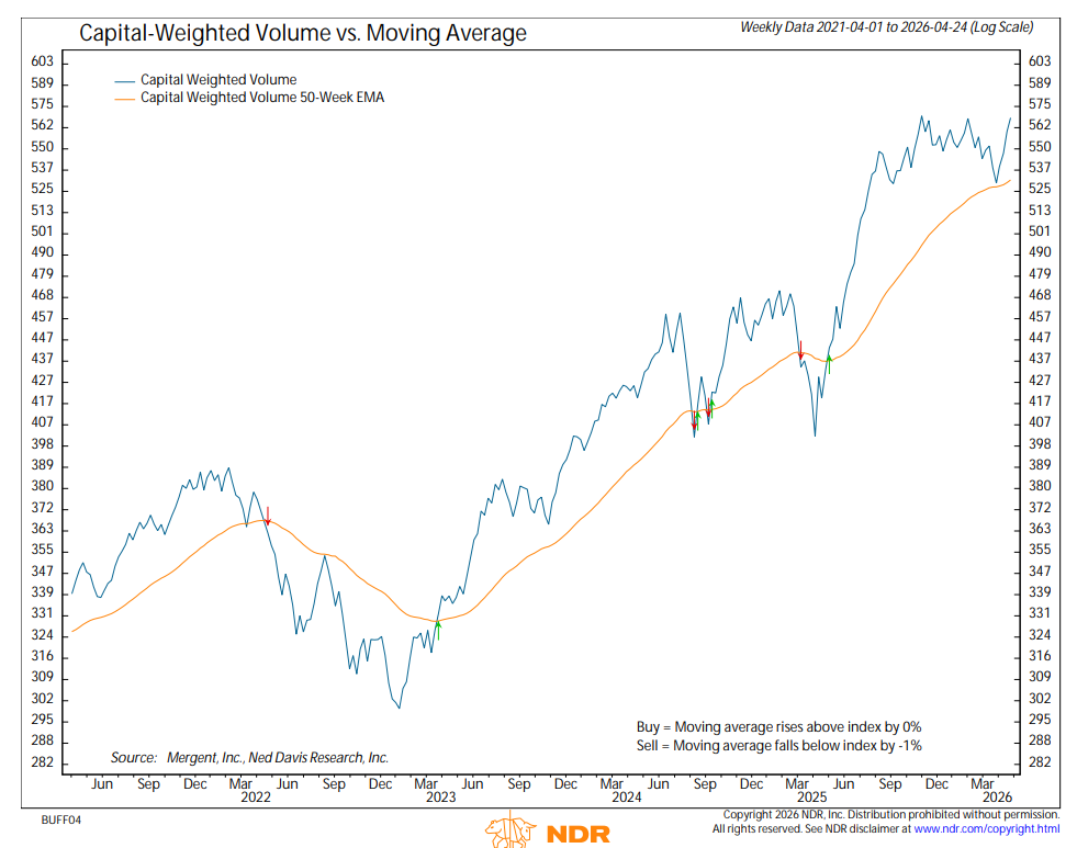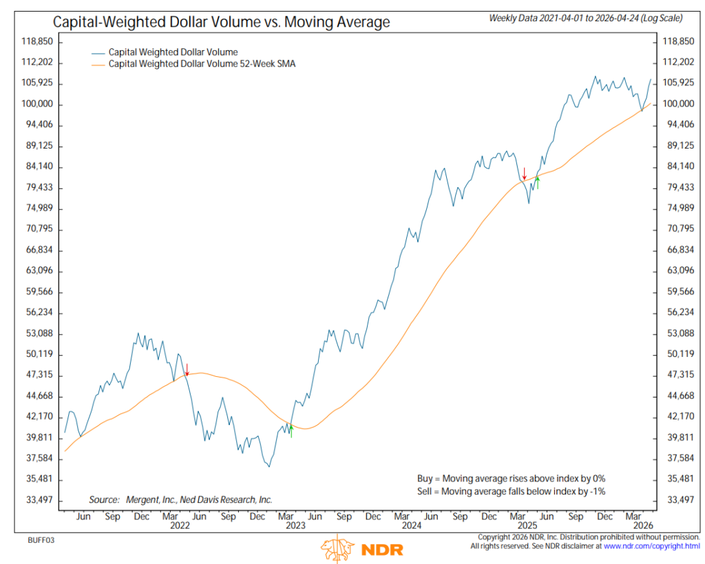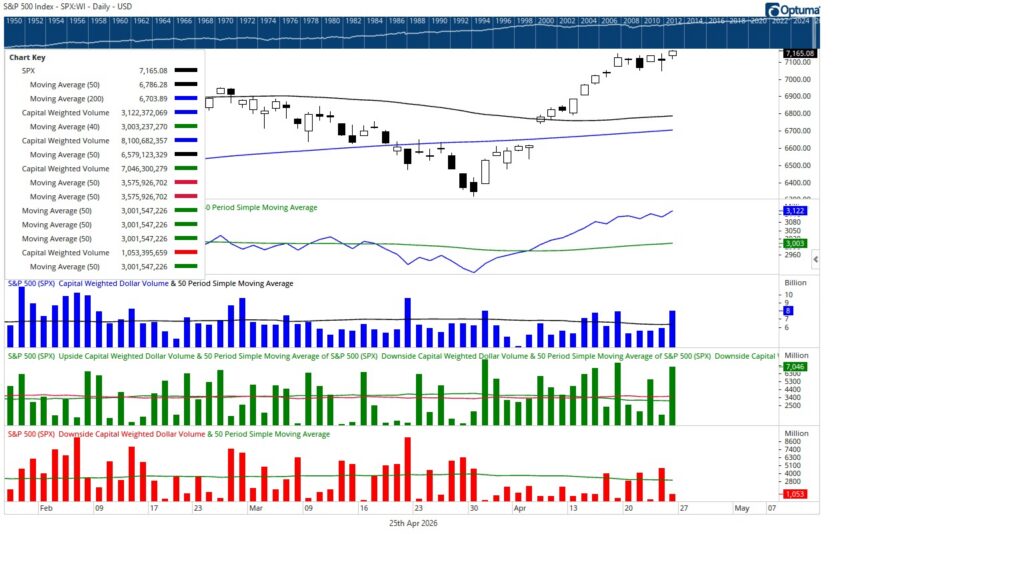 Wednesday, April 22nd delivered a 92% upside S&P 500 Capital Weighted Volume day, though on low participation. The week closed stronger, with Friday posting 85%+ upside volume on high total volume, providing a more credible show of force yet shy of our 90% bogie. For the full week, S&P 500 Capital Weighted Volume was average, with below avg downside volume and average upside volume, resulting in 58% of activity to the upside.