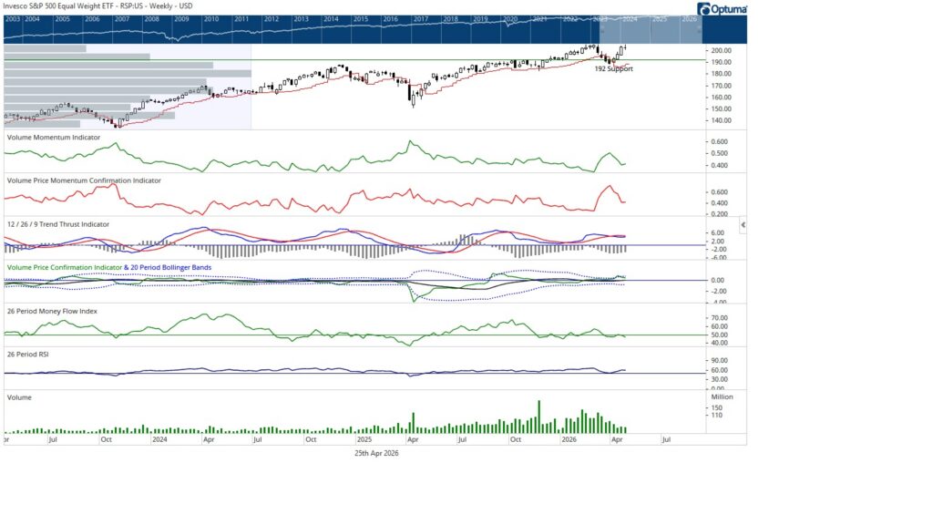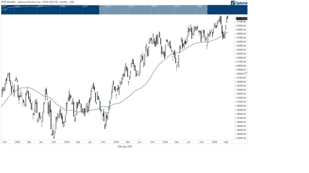 Market breadth is sending a cautionary signal. The NYSE Advance Decline Line began the week near all time highs but faded to close near the weekly low, even as the S&P 500 closed at a new weekly high. This divergence suggests narrowing participation beneath the surface.