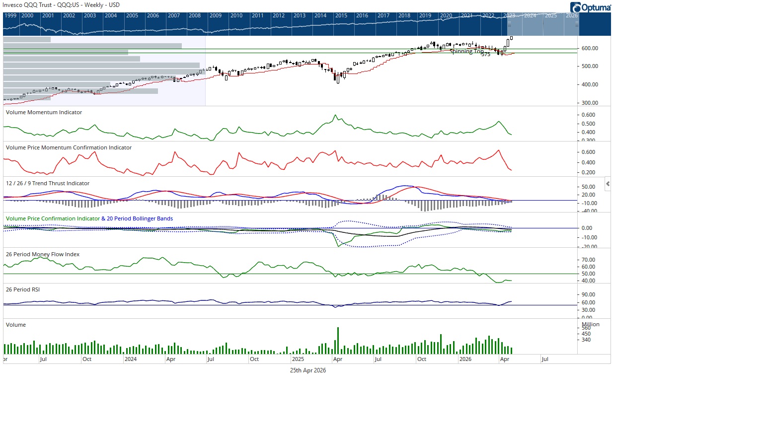 The generals, represented by the Invesco QQQ Trust Series 1, surged to new all time highs, closing up 2.34%. However, volume once again lagged the advance, and like the troops, the volume profile suggests conditions consistent with prior topping behavior rather than sustained accumulation.