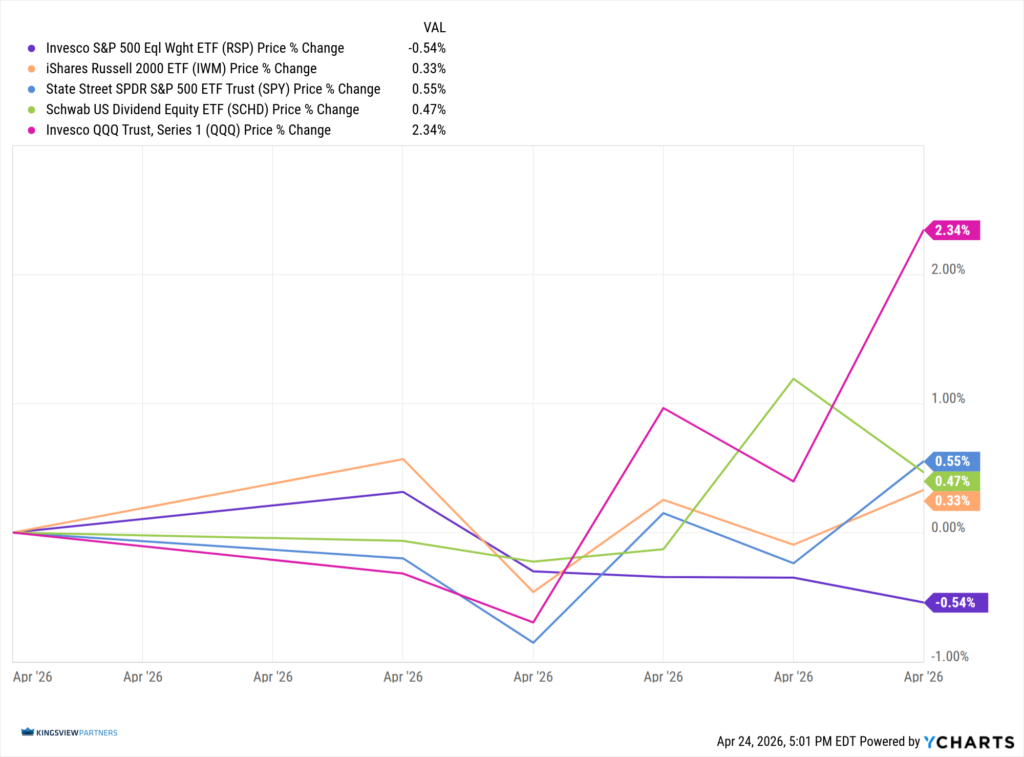 Updated: 4/27/2026. Historical references do not assume that any prior market behavior will be duplicated. Past performance does not indicate future results. This material has been prepared by Kingsview Wealth Management, LLC. It is not, and should not, be regarded as investment advice or as a recommendation regarding any particular security or course of action. Opinions expressed herein are current opinions as of the date appearing in this material only. All investments entail risks. There is no guarantee that investment strategies will achieve the desired results under all market conditions and each investor should evaluate their ability to invest for the long term. Investment advisory services offered through Kingsview Wealth Management, LLC (“KWM”), an SEC Registered Investment Adviser.