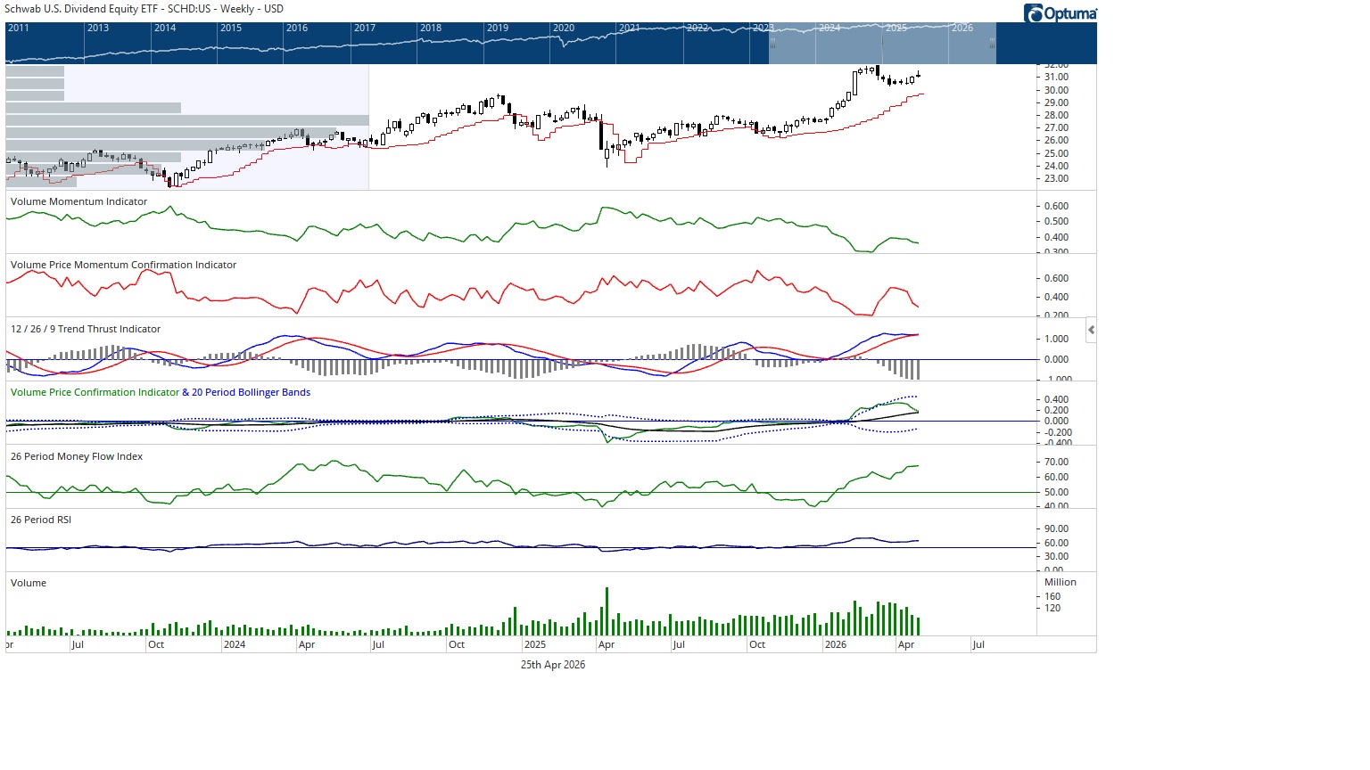 The brass commanders, represented by the Schwab U.S. Dividend Equity ETF, opened the week with a gap higher but failed to hold those gains, closing below the Monday open yet still up 0.47% week over week. Notably, on a volume basis, the brass appear to be the strongest formation, even as their price performance has lagged.
