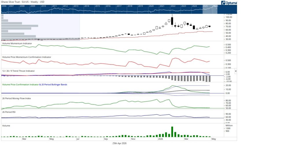 Cross asset signals remain consistent with a rotational environment. Oil rebounded sharply from support, rising nearly $20 on moderate volume, suggesting a tactical response rather than a fully committed trend. Precious metals diverged, with silver (SLV) weakening within its range and gold (GLD) closing lower, forming a spinning candle that reflects indecision.